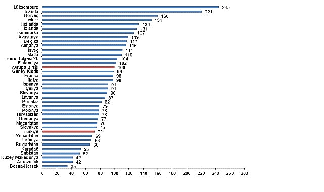 SGP’ye göre kişi başına gayrisafi yurt içi hasıla endeks değeri 72 oldu Satınalma gücü paritesi (SGP) ayrıntılı olarak tanımlanmış standart bir mal ve hizmet sepetinin farklı ülkelerdeki fiyat oranı olarak tanımlanmaktadır.