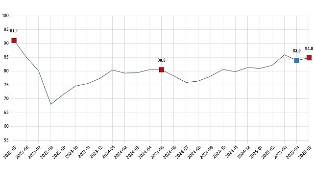 Tüketici güven endeksi 84,8 oldu Türkiye İstatistik Kurumu ve Türkiye Cumhuriyet Merkez Bankası işbirliği ile yürütülen tüketici eğilim anketi sonuçlarından hesaplanan tüketici güven endeksi, Nisan ayında 83,9 iken Mayıs ayında %1,1 oranında artarak 84,8 oldu.